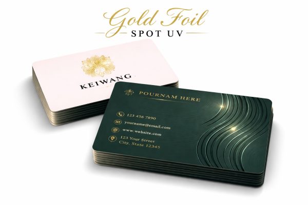 Premium 400gsm card featuring luxurious gold foil, striking spot UV accents, and smooth matte lamination for an elegant, high-end finish.